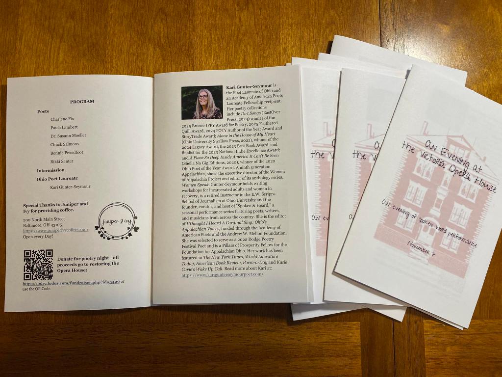Local poets and writers, along with the Poet Laureate of Ohio, Kari Gunter-Seymour gathered for an evening of spoken word performance on Nov. 7, 2025. Kari, an award winning poet and author, and numerous other local writers shared their poems and stories on the beautiful Victoria Opera House stage. Kari Gunter-Seymour is the Executive Director of the Women of Appalachia Project. Learn more about Kari’s work here: https://www.karigunterseymourpoet.com/ . All proceeds from the event benefited the ongoing restoration of the historic Victoria Opera House.