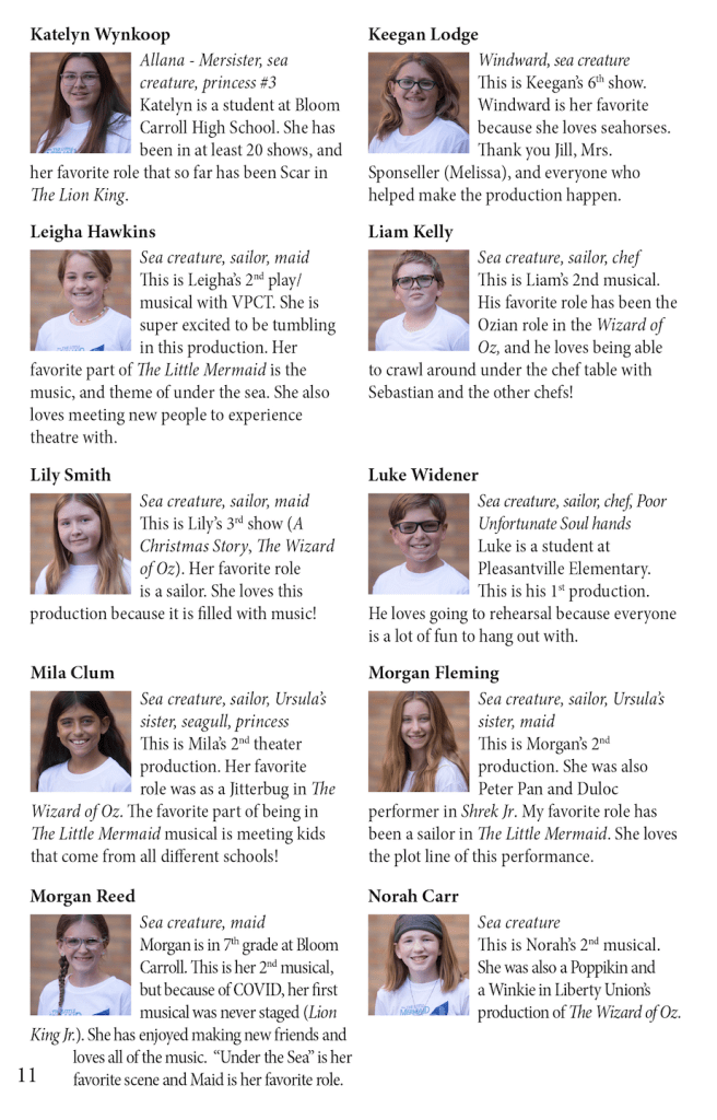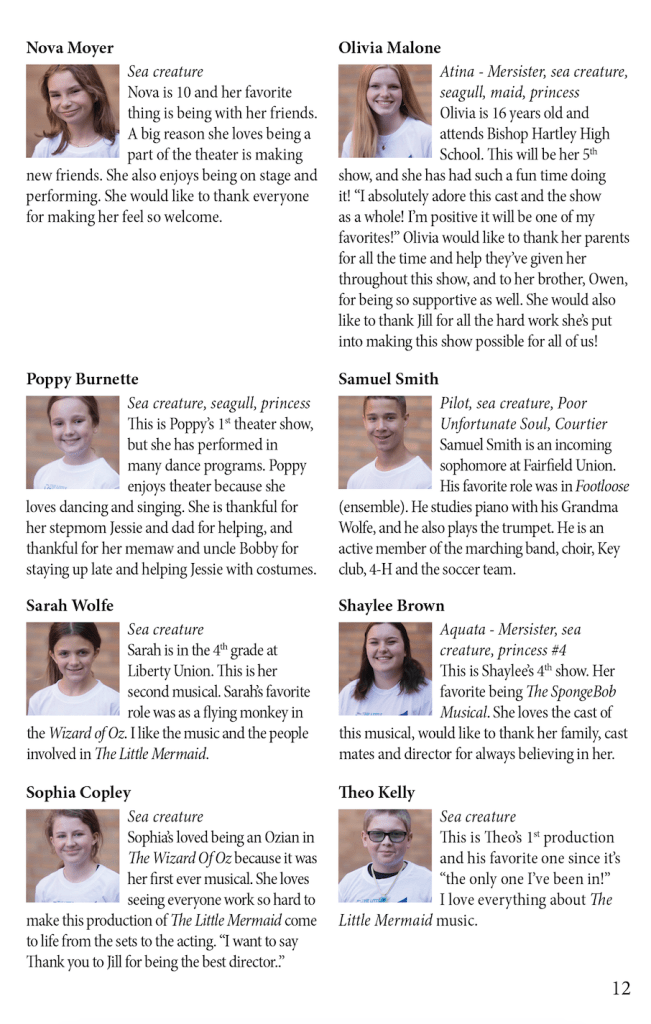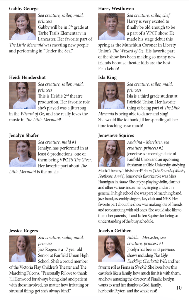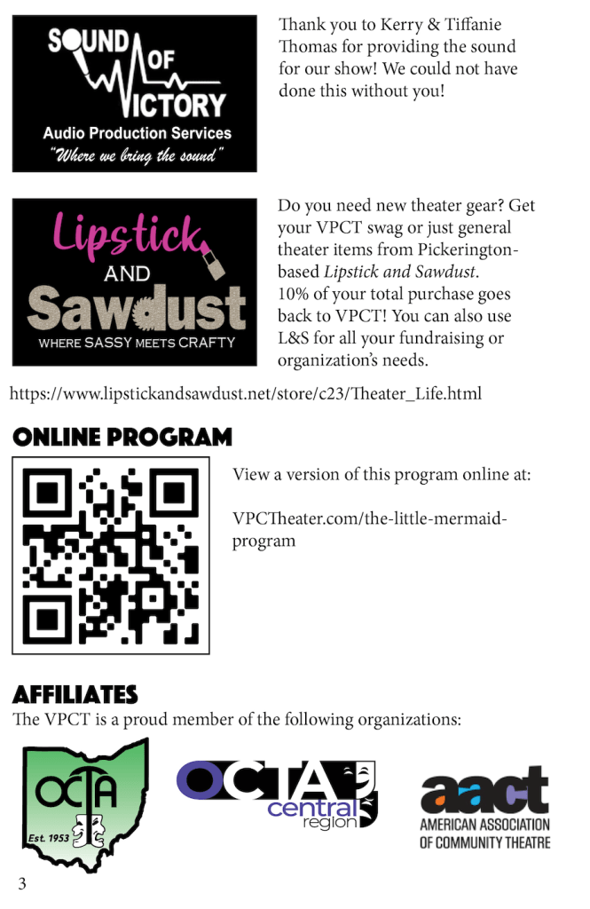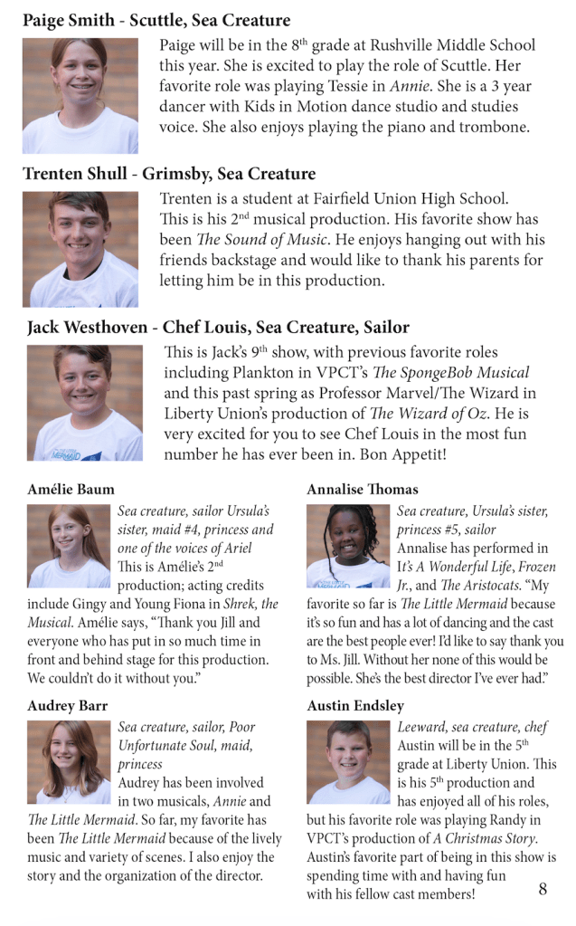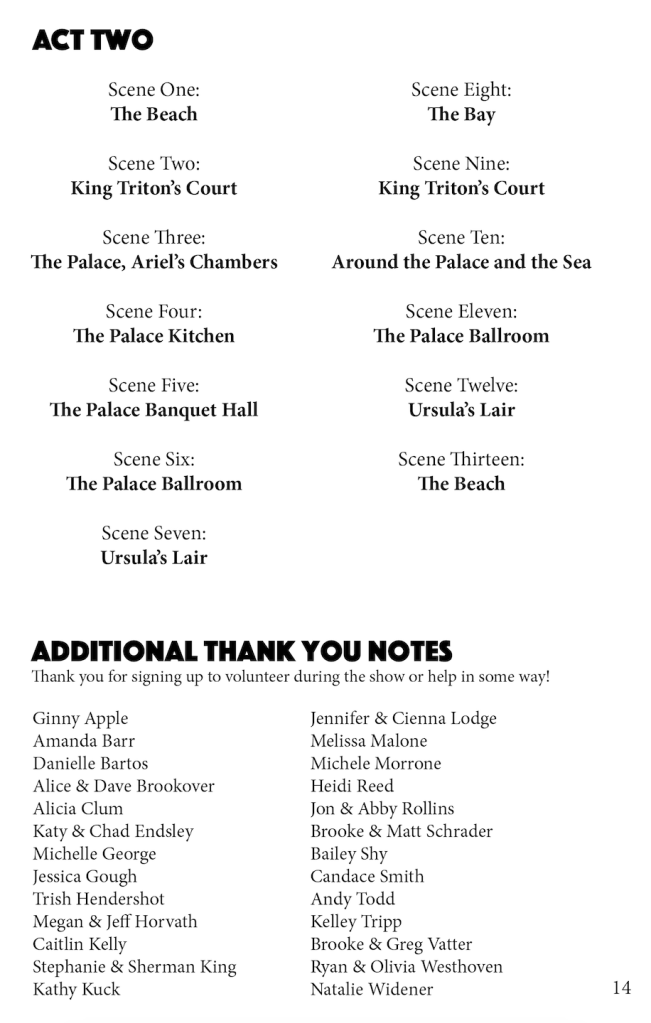 Thanks for coming to see The Little Mermaid! Please support our show sponsors. Thank you to everyone who helped from set building to costume helpers to day of show volunteers. We couldn’t do this without you!